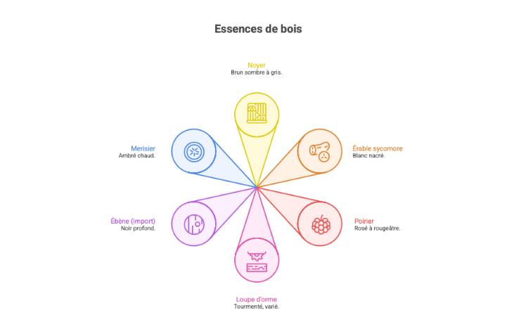 Voici un aperçu des essences couramment utilisées et de leurs fonctions esthétiques dans la marqueterie régionale :